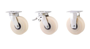 Nylonhjul i svetsad stålbygel med rektangulär fästplatta och dubbelmonteradehjul för låg bygghöjd, lättare svängning och lägre yttryck på underlaget. ...