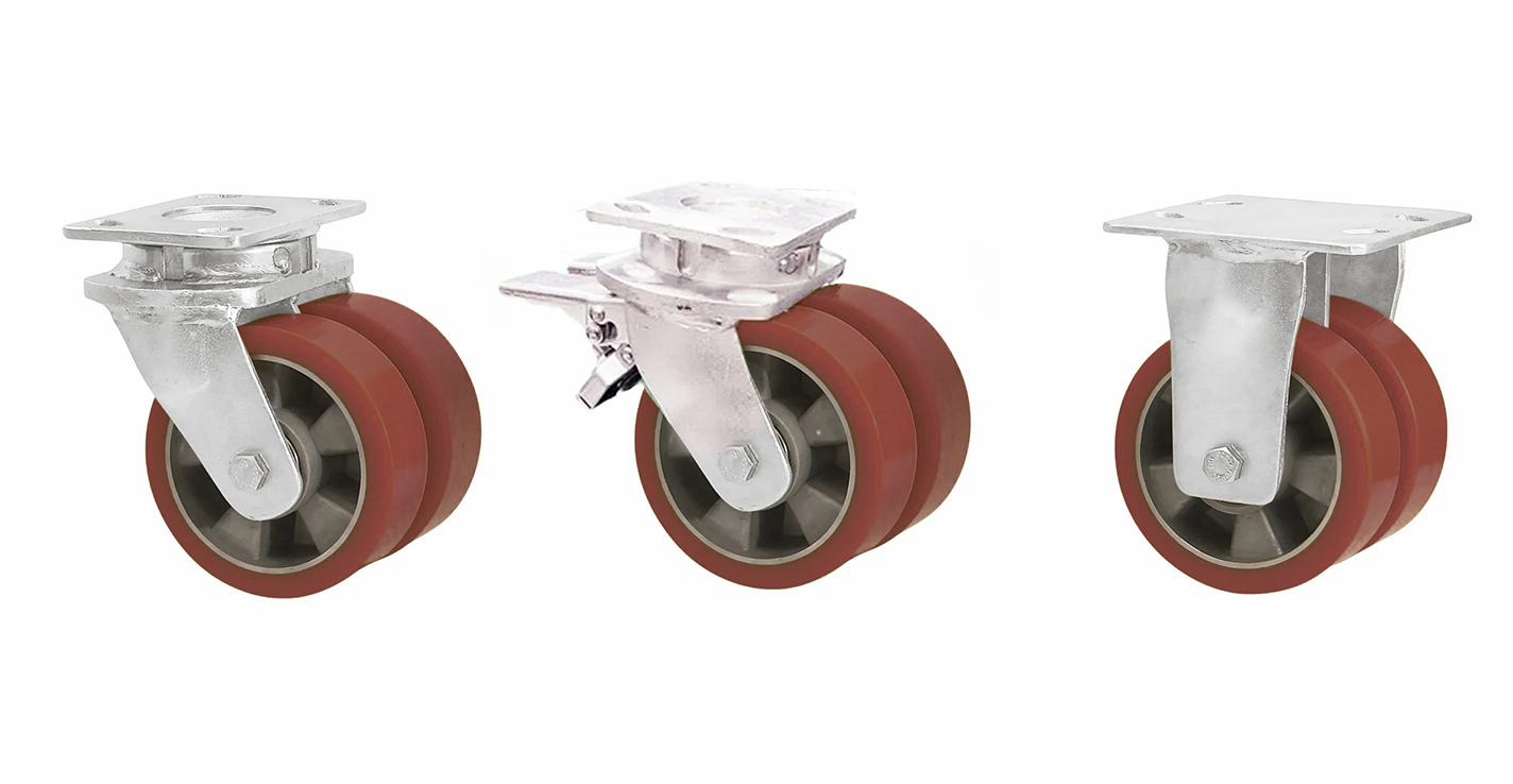 Polyuretanhjul med aluminiumnav i svetsad stålbygel med rektangulär fästplatta och dubbelmonterade hjul för låg bygghöjd, lättare svängning och lägre yttryck på underlaget. Hjulets polyuretan är gjuten på aluminiumnavet vilket ger ett hjul med lågt rullmotstånd, låg vikt, jämn och tyst gång. Dessutom färgar hjulet inte av sig och har en hög slitstyrka. PU-banan är elastisk och återtar sin runda form efter vilande belastning. Beständigt mot oljor, fetter och många kemikalier. Hög motståndskraft mot metallspån, grus och mycket mer. Hjulet har en hårdhet på 93° Shore A ± 2° och tål temperaturer mellan -18°C – +80°C. Bygeln har ett enradigt vridningslager med CNC-svarvad härdad kulbana samt är tätad och med smörjnippel. Kulkransen förenar topplattan och gaffeln vilket gör en centrumbult överflödig. Bromsbara länkhjul har en fotbroms som låser endast hjulet. Gaffelvidd 2x65 mm med 6 mm tjocka gafflar svetsade på både in- och utsida. Axelhål för M12 skruv. Länkbygelns bärighet är 1500 kg. Länkhjul kan förses med separat 4-vägs riktningsspärr, se artnr. 764085.