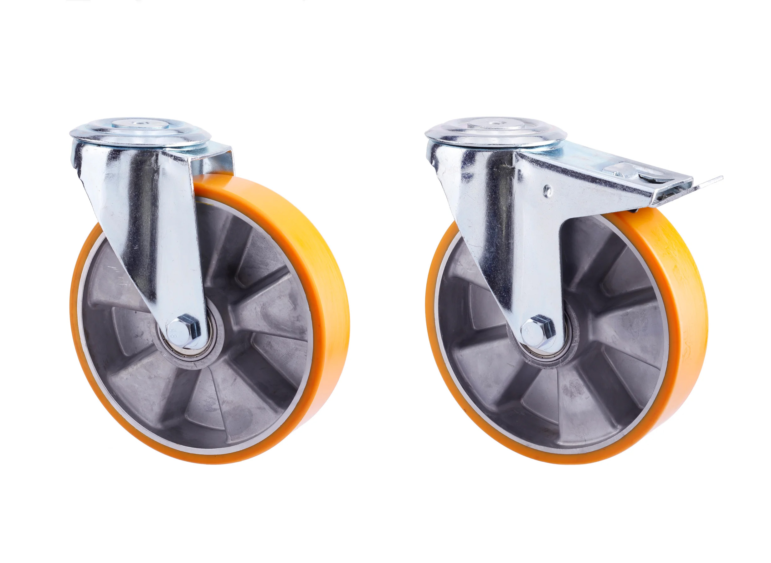 Polyuretanhjul med aluminiumnav i plåtpressad bygel med fästhål för centrumskruv. Polyuretanbanan är gjuten på ett aluminiumnav vilket ger ett hjul med lågt rullmotstånd, låg vikt, jämn och tyst gång samt stor skonsamhet mot underlaget. Hjulet färgar inte heller av sig och har en hög slitstyrka. Hjulbanan är elastisk och återtar sin runda form efter vilande belastning. Beständigt mot oljor, fetter och många kemikalier. Hög motståndskraft mot metallspån, grus och mycket mer. Hjulets hårdhet är 93° ± 2° och tål temperaturer mellan -18°C – +80°C. Bygeln har ett tvåradigt vridningslager. Dessutom är bygelns platta och gaffel sammanfogade med centrumnit. Bromsbara länkhjul har en fotbroms som låser hjul och vridning samtidigt. Bygel för hjuldiameter 80-125 mm: Gaffelvidd 46 mm, 2,5 mm tjocka gafflar, axelhål för M8 skruv. Bygel för hjuldiameter 160-200 mm: Gaffelvidd 61 mm, 3 mm tjocka gafflar, axelhål för M12 skruv.