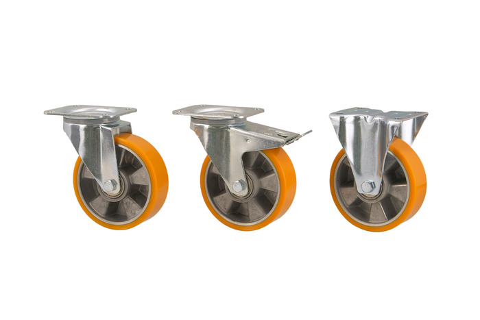 Polyuretanhjul med aluminiumnav i plåtpressad bygel med rektangulär fästplatta. Polyuretanbanan är gjuten på ett aluminiumnav vilket ger ett hjul med lågt rullmotstånd, jämn och tystgång samt stor skonsamhet mot underlaget. Hjulet färgar inte av sig och har en hög slitstyrka. Banan är elastisk och återtar sin runda form efter vilande belastning. Beständigt mot oljor, fetter och många kemikalier. Hög motståndskraft mot metallspån, grus och mycket mer. Hjulets hårdhet är 93°± 2° Shore A. och tål temperaturer mellan -18°C – +80°C. Bygeln har ett tvåradigt vridningslager samt platta och gaffel är sammanfogade med centrumnit. Bromsbara länkhjul har en fotbroms som låser hjul och vridning samtidigt. Bygel för hjuldiameter 80-125 mm: Gaffelvidd 46 mm, 2,5 mm tjocka gafflar, axelhål för M8 skruv. Bygel för hjuldiameter 125-200 mm: Gaffelvidd 61 mm, 3 mm tjocka gafflar, axelhål för M12 skruv.
