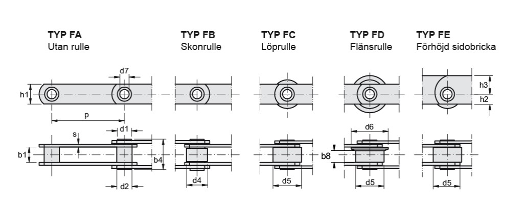 | Artikelnummer | Delning P mm | Delning P mm, alt. 2 | Delning P mm, alt. 3 | Delning P mm, alt. 4 | Brottbelastning N | Brickhöjd h2 mm | Skon rulle typ B d4 | Löp rulle typ C d5 | Fläns rulle typ D d5 | Fläns rulle typ D d6 | Fläns rulle typ D d8 | Invändig bredd b1 mm | Bultdiameter d1 mm | Hylsdiameter d2 mm | Brickhöjd h1 mm | Brickhöjd h3 mm |