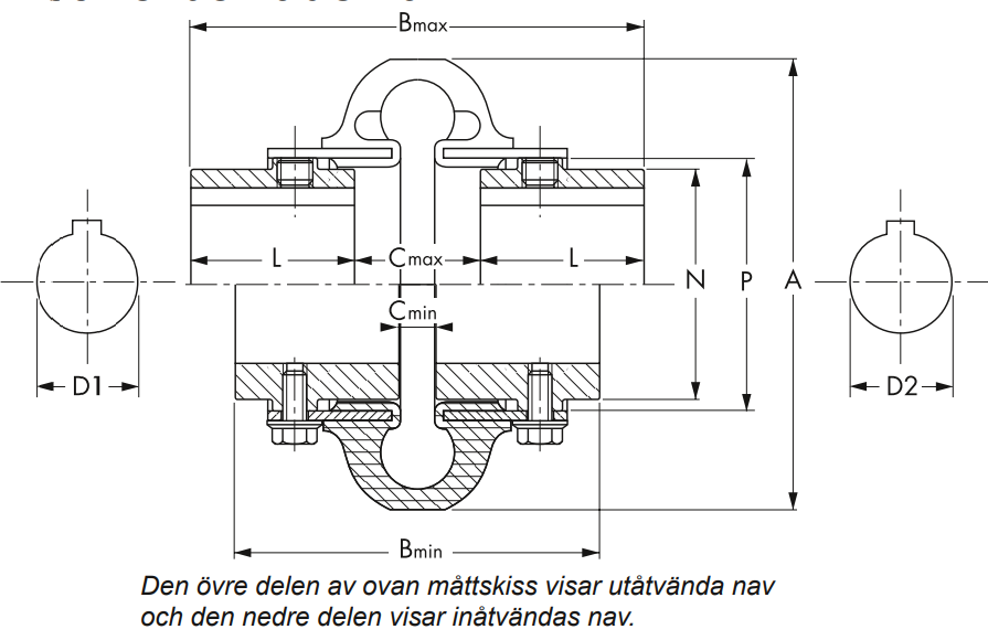 | Artikelnummer | A mm | B min mm | B max mm | C min mm | C max mm | L mm | N mm | J kgm² | N mm | Vikt kg | Nominellt vridmoment Mvnom Nm | Axelhål min d1/d2 mm | Axelhål max d1/d2 mm | p mm | Max varvtal (1) n r/min |