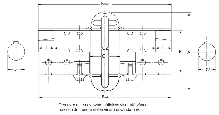 | Artikelnummer | Vridmoment Mv Nm | Varvtal (1) n min | Klämbussning storlek | Axelhål (2) D1 / D2 min mm | Axelhål (2) D1 / D2 max mm | A mm | B min mm | B max mm | C min mm | C max mm | L mm | N mm | J kgm² | Vikt (3) kg | N mm | Klämbussning storlek | Axelhål (2) D1 / D2 min mm | Axelhål (2) D1 / D2 max mm |